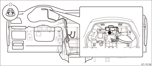 1. Disconnect the ground terminal from battery sensor. NOTE 2. Remove the combination meter assembly. Combination Meter > REMOVAL 3. Remove the center grille assembly. Center Console > REMOVAL 4. Remove the heater control assembly. Center Console > REMOVAL 5. Remove the audio assembly or navigation assembly. Audio > REMOVAL 6. Remove the GPS antenna assembly. (1) Disconnect the GPS antenna assembly connector on the audio unit or navigation unit side, and tie a string to the connector. NOTE: • A string makes operation easier during installation. • For the model with telematics, also tie a string to the connector on the data communication module side. (2) Remove the screw and harness clamp, and pull out the GPS antenna assembly from the combination meter side. • Model without telematics