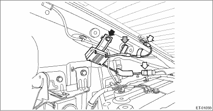 2. OUTBACK MODEL 1. Disconnect the ground terminal from battery sensor. NOTE 2. Remove the trim panel - rear gate. Rear Gate Trim > REMOVAL 3. Remove the noise suppressor assembly. (1) Remove the connector and harness clip. (2) Remove the bolts, then remove the noise suppressor assembly.