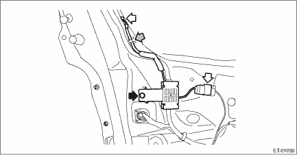 1. SEDAN MODEL 1. Disconnect the ground terminal from the battery sensor, and wait for at least 60 seconds before starting work. NOTE 2. Remove the trim panel - rear pillar UPR. Rear Quarter Trim > REMOVAL 3. Remove the noise suppressor assembly. (1) Remove the connector and harness clip. (2) Remove the bolts, then remove the noise suppressor assembly.