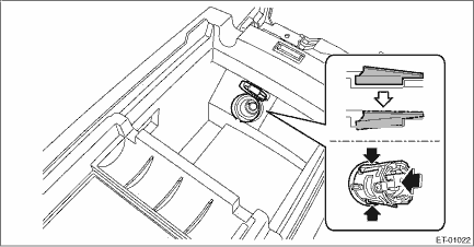 1. CONSOLE 1. Disconnect the ground terminal from the battery sensor, and wait for at least 60 seconds before starting work. NOTE 2. Remove the cover assembly - front and the console box assembly. Console Box > REMOVAL 3. While releasing the claw inside, press it in from the rear to remove the socket assembly.