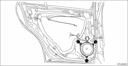 1. Disconnect the ground terminal from battery sensor. NOTE 2. Remove the trim panel - rear door. Door Trim > REMOVAL 3. Remove the speaker assembly - rear door. (1) Disconnect the connector. (2) Remove the screws and remove the speaker assembly - rear door.