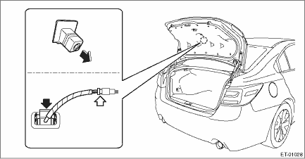 1. SEDAN MODEL 1. Disconnect the ground terminal from battery sensor. NOTE 2. Remove the trim panel - trunk lid. Trunk Room Trim > REMOVAL 3. Remove the garnish - trunk. Trunk Lid Garnish > REMOVAL 4. Remove the rearview camera assembly. CAUTION: Do not drop or apply any impact to the rearview camera because it is a precision equipment. (1) Disconnect the connector. (2) Release the claw and hook, and then remove the rearview camera assembly.