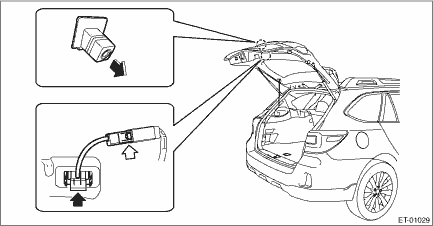 2. OUTBACK MODEL 1. Disconnect the ground terminal from battery sensor. NOTE 2. Remove the trim panel - rear gate. Rear Gate Trim > REMOVAL 3. Remove the garnish assembly - rear gate. Rear Gate Garnish > REMOVAL 4. Remove the rearview camera assembly. CAUTION: Do not drop or apply any impact to the rearview camera because it is a precision equipment. (1) Disconnect the connector. (2) Release the claw and hook, and then remove the rearview camera assembly.
