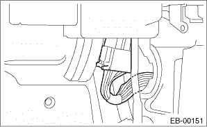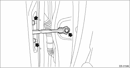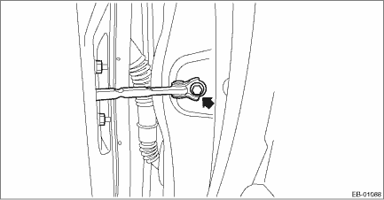 (1) Put a wooden block on a floor jack and place the jack under the panel assembly - front door. (2) Support the panel assembly - front door with the jack to protect it from damage. CAUTION: • Do not excessively lift the panel assembly - front door with the floor jack. The door hinges may be damaged. • While removing or installing, do not use a jack, etc. on the garnish section. 20. Remove the bolts on the side of the panel assembly - front door of the upper hinge - front door and the lower hinge - front door to remove the panel assembly - front door. CAUTION: The panel assembly - front door is heavy. When removing and installing it, always work in a team of two or more persons. 2. FRONT DOOR HINGE 1. Disconnect the ground terminal from the battery sensor, and wait for at least 60 seconds before starting work. NOTE 2. Remove the garnish assembly - door. (OUTBACK model) Side Garnish > REMOVAL 3. Remove the cover side sill - front and the front cover - side sill. Lower Inner Trim > REMOVAL 4. Disconnect the front door harness connectors. (1) Disconnect the connector of door harness from body harness.