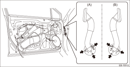 1. FRONT DOOR PANEL 1. Disconnect the ground terminal from the battery sensor, and wait for at least 60 seconds before starting work. NOTE 2. Remove the garnish assembly - door. (OUTBACK model) Side Garnish > REMOVAL 3. Remove the trim panel - front door. Door Trim > REMOVAL 4. Remove the sealing cover - front door. Front Sealing Cover > REMOVAL 5. Remove the outer mirror assembly. Outer Mirror Assembly > REMOVAL 6. Remove the front door speaker assembly. Front Speaker > REMOVAL 7. Remove the cover B pillar - front door INN. CAUTION: Always replace with a new part, because engagement of the claw weakens.