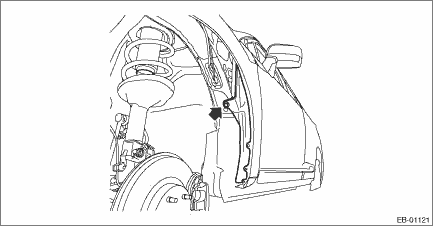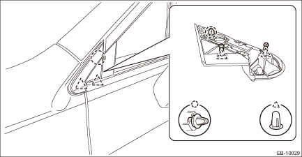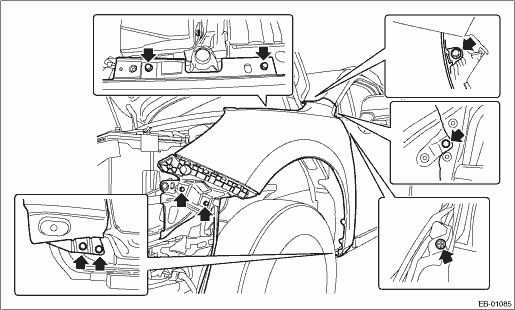 1. FENDER PANEL 1. Disconnect the ground terminal from battery sensor. NOTE 2. Remove the bumper face - front. Front Bumper > REMOVAL 3. Remove the light assembly - head. Headlight Assembly > REMOVAL 4. Remove the cover - front fender UPR. (1) Remove the clip. (2) Release the claws by pulling them forward, and remove the cover - front fender UPR. CAUTION: Forcibly removing the part may cause creases.