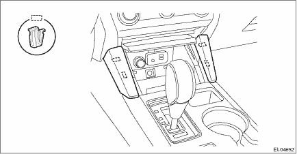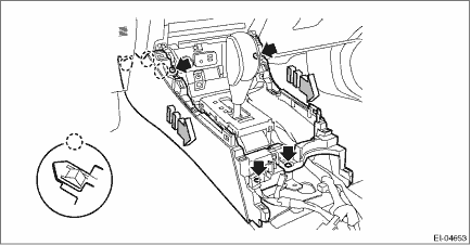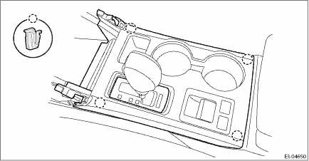 CAUTION: Refer to “CAUTION” of “General Description” before handling the airbag system components. General Description > CAUTION 1. Disconnect the ground terminal from the battery sensor, and wait for at least 60 seconds before starting work. NOTE NOTE: • On CVT models, shift the select lever into “N” before disconnecting the battery ground cable. • On power seat models, move the front seat all the way forward before disconnecting the battery ground cable. 2. Release the clips, and remove the ornament panel - console.