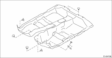 1. Disconnect the ground terminal from battery sensor. NOTE NOTE: • On CVT models, shift the select lever into “N” before disconnecting the battery ground cable. • For models with power seat, remove the slide rail installing bolt before disconnecting the ground terminal from the battery sensor. 2. Remove the front seat assembly. Front Seat > REMOVAL 3. Remove the rear seat cushion assembly. Rear Seat > REMOVAL 4. Remove the console box assembly, the cover - shift lever and the panel center LWR. Console Box > REMOVAL 5. Remove the lower inner trim on the RH and LH sides. Lower Inner Trim > REMOVAL 6. Remove the pull handle cover. Remote Openers > REMOVAL 7. Take out the floor mat from the vehicle. (1) Remove the clips from the floor mat using the remover. (2) Remove the mat hook on both sides. (3) Take out the floor mat after folding down.