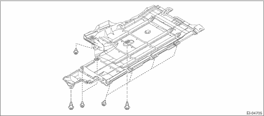 1. Lift up the vehicle. NOTE: A plate type lift cannot be used. 2. Remove the fuel tank protector. • H4 model: Fuel Tank Protector > REMOVAL • H6 model: Fuel Tank Protector > REMOVAL 3. Remove the bolts and clips, and remove the floor under protector.