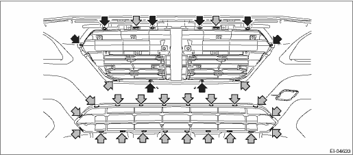 1. Disconnect the ground terminal from battery sensor. NOTE 2. Remove the bumper face - front. Front Bumper > REMOVAL 3. Remove the front grille assembly. (1) Remove the screws on the back side. (2) Release the claws, and remove the front grille assembly and the cover intake - front.