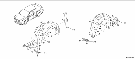 1. Lift up the vehicle. 2. Remove the wheels. 3. Remove the clips, then remove the mud guard.