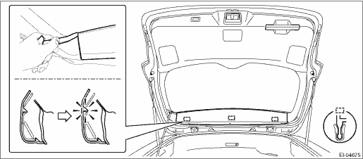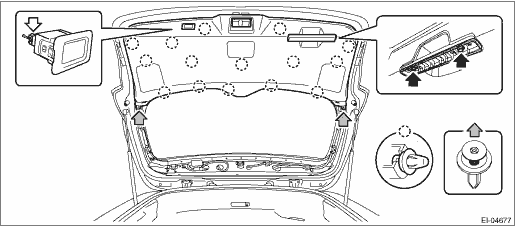 1. Remove the trim panel - rear gate UPR. (1) Remove the claws on the trim edge. (2) Release the claws in the center of trim, and remove the trim panel - rear gate UPR.