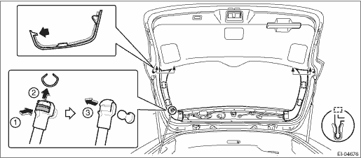 2. Remove the trim panel - rear gate pillar side. (1) Disconnect the rod - power rear gate before removing the trim panel - rear gate pillar side LH. (Only for models with power rear gate) CAUTION: For the disconnection procedure of the rod - power rear gate, refer to “REMOVAL”, “Power Rear Gate Rod” in the “POWER REAR GATE” section and observe the precautions for removal. Power Rear Gate Rod > REMOVAL (2) Release the claws. (3) Remove the claws on the bottom of trim, and remove the trim panel - rear gate pillar side.