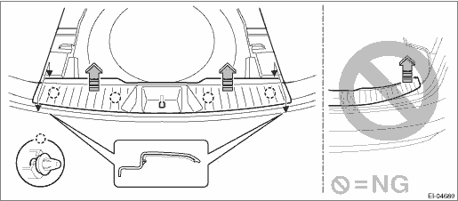 4. Remove the clips, and remove the trim panel - rear skirt. CAUTION: • Do not lift the trim panel - rear skirt from the edge. Doing so may damage the part. • Do not reuse the clips. Once the clip is removed, its holding force is reduced. Be sure to replace it with a new clip.