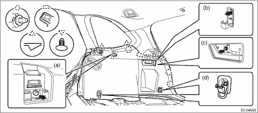 5. Remove the trim panel - rear apron. (1) Remove the covers, screws, and bolts. (a), (c), (d) (2) Take out the hook and remove the screw inside. (b) (3) Remove the clips, and remove the trim panel - rear apron.