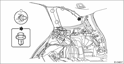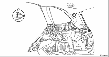 NOTE: For LH side, disconnect the accessory socket connector. 6. Remove the rear quarter trim UPR. (1) Remove the screws and clips, and remove the rear quarter trim UPR - rear.