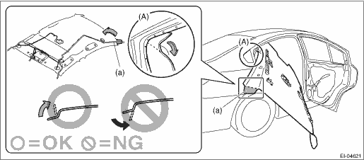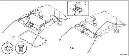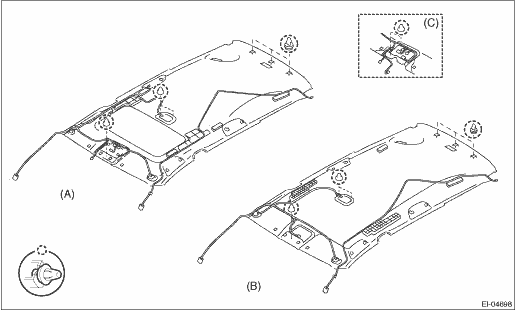 9. Remove the following parts from the passenger’s side rear door. • Rear door trim assembly: Door Trim > REMOVAL • Rear speaker assembly: Rear Speaker > REMOVAL • Checker assembly - rear door: Rear Door > REMOVAL 10. Remove the overhead console assembly. (Models without EyeSight) Spot Map Light > REMOVAL 11. Remove the stereo camera cover. (Models with EyeSight) Stereo Camera > REMOVAL 12. Remove the left and right sun visor assembly. Sun Visor > REMOVAL 13. Remove the light assembly - room. Room Light > REMOVAL 14. Remove all assist grip assembly. Assist Grip > REMOVAL 15. Remove the sunroof garnish. (Model with sunroof)