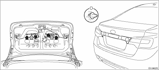 1. Disconnect the ground terminal from battery sensor. NOTE 2. Remove the trim panel - trunk lid. Trunk Room Trim > REMOVAL 3. Remove the garnish - trunk. (1) Remove the nut. (2) Disconnect the clips and connectors, and remove the garnish - trunk.