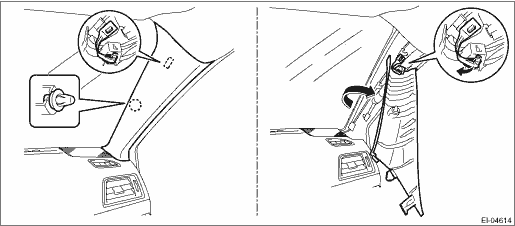 3. Remove the rear seat cushion assembly. Rear Seat > REMOVAL 4. Remove the cover side sill - front, cover side sill - rear, and the trim panel - center pillar LWR. Lower Inner Trim > REMOVAL 5. Remove the trim panel - center pillar UPR. (1) Remove the cap (a), and remove the bolts. (2) Remove the lower anchor bolt of the seat belt outer - front. NOTE: On passenger’s side, disconnect the connector of the seat belt tension sensor. Airbag Connector > PROCEDURE (3) Release the clip by pulling the lower part of the trim toward you. (4) Expand the claws outward, and remove the trim panel - center pillar UPR. CAUTION: • Do not expand the trim panel - center pillar UPR excessively. Doing so may damage the trim. • If the claw is damaged, always replace the trim panel - center pillar UPR with a new part, because the damaged claw cannot hold the part sufficiently.