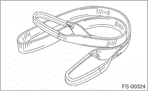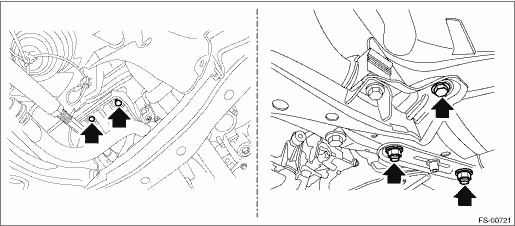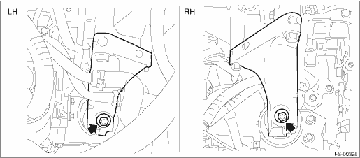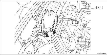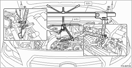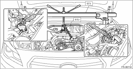 Tightening torque: 19 N·m (1.9 kgf-m, 14.0 ft-lb) 9. Install the ST for the engine hanger to the engine front side. (H4 model) (1) Remove the belt cover. (2) Attach the ST. Preparation tool: H4 model (ST1): BOLT (18363AA050) H4 model (ST2): HANGER (18360AA040)