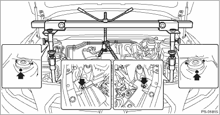 Tightening torque: 19 N·m (1.9 kgf-m, 14.0 ft-lb) 10. Suspend the engine using ST, chain sling, and shackle. (1) Set the ST on the vehicle. CAUTION: • Install the M8 bolt at the locations shown in the figure, and place the front side arms of ST (ENGINE HANGER). • Set the arms of ST (ENGINE HANGER) at the locations shown in the figure. Preparation tool: ST1: ENGINE HANGER (99099AJ000) ST2: CHAIN BALANCER (99099AJ010)