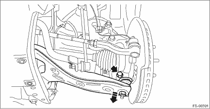 13. Remove the universal joint. Universal Joint > REMOVAL CAUTION: To prevent damage to the universal joint and error of handling force, make sure to remove the universal joint. 14. Remove the front exhaust pipe. • H4 model: Front Exhaust Pipe > REMOVAL • H6 model: Front Exhaust Pipe > REMOVAL 15. Remove the stabilizer link assembly. Front Stabilizer > REMOVAL 16. Disconnect the left and right front arms. (1) Remove the nut, and pull out the bolt from the front lower arm. (2) Remove the ball joint from the front lower arm.