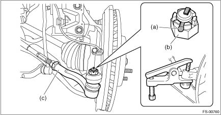 17. Disconnect the left and right tie-rod ends. (1) Pull out the cotter pin (a). (2) Remove the castle nut (b). (3) Extract the tie-rod end (c) from the housing assembly - front axle. CAUTION: Use a tool appropriate to the structure, and be careful not to damage the boot of the joint while removing. The boot may be damaged depending on the tool used. Preparation tool: Tie-rod ball joint puller