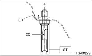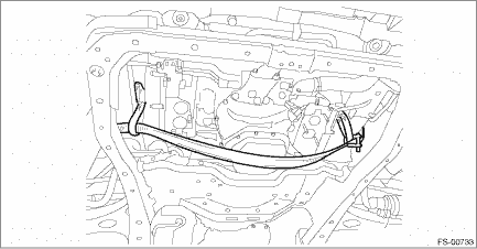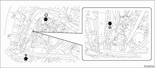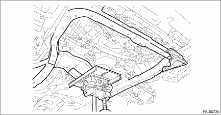 3. Remove the under cover - front. Front Under Cover > REMOVAL 4. Disconnect the ground terminal from battery sensor. NOTE 5. Remove the air intake duct. Air Intake Duct > REMOVAL 6. Remove the air intake boot assembly. • H4 model: Air Intake Boot > REMOVAL • H6 model: Air Intake Boot > REMOVAL 7. Fully open the front hood. NOTE 8. Replace the engine hanger attached to the engine with ST. (H6 model) (1) Remove the engine harness connector.