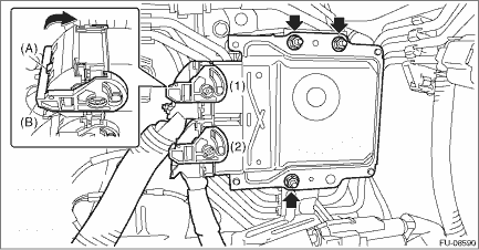 1. Disconnect the ground terminal from battery sensor. NOTE 2. While pressing the section (A) shown in the figure, move the lock lever (B) in the direction of the arrow to disconnect the connectors from the ECM in numerical order as shown in the figure. 3. Remove the ECM from the ECM bracket.