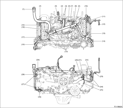 1. Disconnect the ground terminal from battery sensor. NOTE 2. Remove the intake manifold assembly. Intake Manifold Assembly > REMOVAL 3. Disconnect each connector to remove the engine wiring harness. • Structural diagram 1