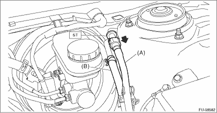 WARNING: Place “NO OPEN FLAMES” signs near the working area. CAUTION: Be careful not to spill fuel. 1. Release the fuel pressure. Fuel > PROCEDURE 2. Open the fuel filler lid and remove the fuel filler cap. NOTE: This operation is required to release the inner pressure of the fuel tank. 3. Remove the floor mat. Floor Mat > REMOVAL 4. In the engine compartment, disconnect the fuel delivery tube and evaporation hose. CAUTION: • Be careful not to spill fuel. • Catch the fuel from hoses using a container or cloth. (1) Disconnect the fuel delivery tube (A). • When using ST (1) Attach ST to the pipe and push ST in the direction of arrow mark to disconnect the quick connector.