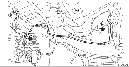 7. Remove the rear mud guard LH. Mud Guard > REMOVAL 8. Remove the purge pipe and purge hose. NOTE: Disconnect the quick connector as shown in the figure.