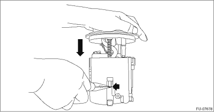 4. Push the fuel filter assembly in the direction of the arrow to compress, and detach the clip.