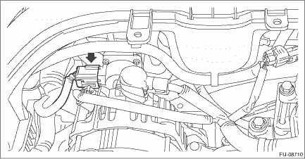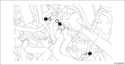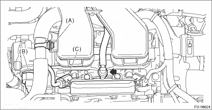 1. Release the fuel pressure. Fuel > PROCEDURE 2. Disconnect the ground terminal from battery sensor. NOTE 3. Open the fuel filler lid and remove the fuel filler cap. NOTE: This operation is required to release the inner pressure of the fuel tank. 4. Drain approximately 3.0 L (3.2 US qt, 2.6 Imp qt) of coolant. Engine Coolant > REPLACEMENT 5. Remove the clip (A), and loosen the clamps (B) and (C) securing the air intake boot.