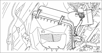 14. Remove the air intake duct. Air Intake Duct > REMOVAL 15. Disconnect the connector (A) from the mass air flow and intake air temperature sensor, and remove the clip (B) securing the bulkhead wiring harness. 16. Remove the clip (C), and the air cleaner case (rear) together with the air cleaner element.