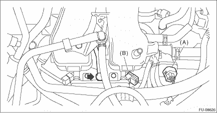 13. Disconnect the brake booster vacuum hose (A), and disconnect the connector (B) from the purge control solenoid valve.