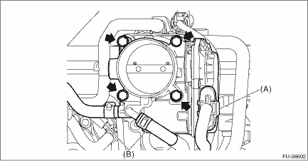 5. Disconnect the connectors (A) from the throttle position sensor. 6. Disconnect the preheater hose (B) from the throttle body. 7. Remove the throttle body from the intake manifold assembly.