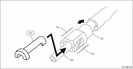 CAUTION: • Be careful not to spill fuel. • Catch the fuel from hoses using a container or cloth. • Holding the portion (c) shown in the figure, pull the connector in axial direction. • If the connector and pipe are sticking to each other, push and pull the connector with ST pushed, and then pull the connector after it starts moving freely. • When disconnecting the connector, do not bend or twist the tube forcibly. If the tube is bent, replace with a new part. NOTE: Clean the pipe and quick connector, if they are covered with dust.