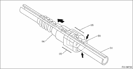 • When not using ST (1) Push the retainer in the direction of the arrow, disconnect the quick connector from pipe. CAUTION: • Be careful not to spill fuel. • Catch the fuel from hoses using a container or cloth. • Holding the portion (d) shown in the figure, pull the connector in axial direction. • If the connector and pipe are sticking to each other, push and pull the connector with the retainer pushed in the direction of the arrow, and then pull the connector after it starts moving freely. • When disconnecting the connector, do not bend or twist the tube forcibly. If the tube is bent, replace with a new part. NOTE: Clean the pipe and quick connector, if they are covered with dust.