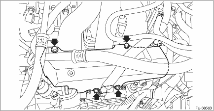 10. Remove the fuel injector while lifting up the fuel injector pipe. CAUTION: • Be careful not to spill fuel. • Catch the fuel from the pipes using a container or cloth.