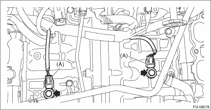 2. Disconnect the ground terminal from battery sensor. NOTE 3. Remove the intake manifold. Intake Manifold > REMOVAL 4. Disconnect the connector (A) from the knock sensor, and remove the knock sensor from the cylinder block.