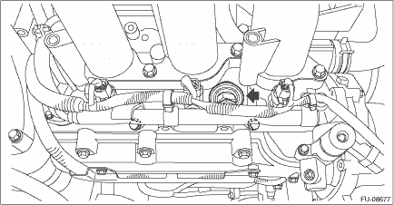9. Remove the pulsation damper RH from the fuel injector pipe RH. CAUTION: • Be careful not to spill fuel. • Catch the fuel from the pipes using a container or cloth.