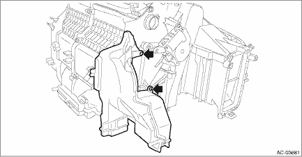 CAUTION: Before handling the airbag system components, refer to “CAUTION” of “General Description” in “AIRBAG SYSTEM”. General Description > CAUTION 1. Disconnect the ground terminal from the battery sensor, and wait for at least 60 seconds before starting work. NOTE 2. Remove the heater and cooling unit assembly. Heater and Cooling Unit > REMOVAL 3. Pull out the heater core. Heater Core > REMOVAL 4. Remove the screws, and remove the duct - foot assist.