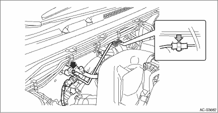 1. Disconnect the ground terminal from battery sensor. NOTE 2. Using the refrigerant recovery system, discharge refrigerant. Refrigerant Recovery Procedure > PROCEDURE 3. Disconnect the hose - pressure suction and the pipe - evaporator cooling. CAUTION: Seal the disconnected hose, pipe and engaging part of expansion valve with a plug or vinyl tape to prevent foreign matter from entering. (1) Disconnect the connector. (2) Detach the clips and bolts, and detach the hose - pressure suction and the pipe - evaporator cooling.