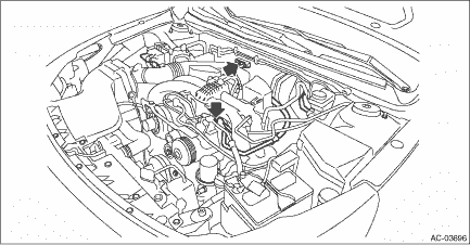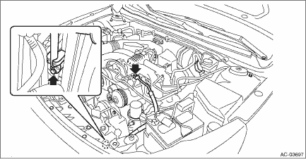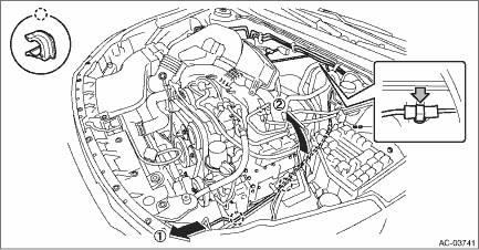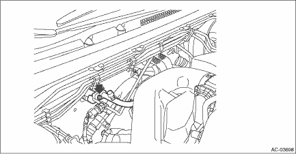 3. A/C PIPE 1. Disconnect the ground terminal from battery sensor. NOTE 2. Using the refrigerant recovery system, discharge refrigerant. Refrigerant Recovery Procedure > PROCEDURE 3. Remove the battery and battery box. • H4 model: Battery > REMOVAL • H6 model: Battery > REMOVAL 4. Remove the air intake boot. • H4 model: Air Intake Boot > REMOVAL • H6 model: Air Intake Boot > REMOVAL 5. Remove the clutch pipe, connector and connector bracket. (MT model) Clutch Pipe and Hose > REMOVAL 6. Remove the reservoir tank. • H4 model: Reservoir Tank > REMOVAL • H6 model: Reservoir Tank > REMOVAL 7. Remove the bumper face - front. Front Bumper > REMOVAL 8. Remove the active grille shutter. (H4 model) Active Grille Shutter > REMOVAL 9. Remove the bolts and detach the hose - pressure suction. CAUTION: Seal the disconnected hose and engaging part of expansion valve with a plug or vinyl tape to prevent foreign matter from entering.