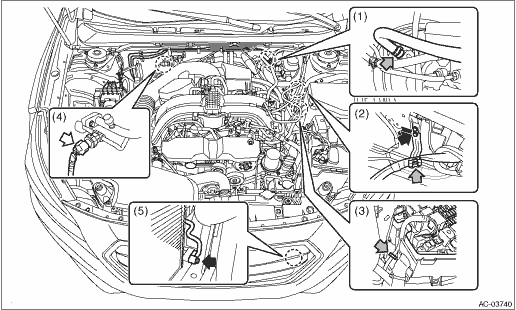 2. HIGH-PRESSURE HOSE 1. Disconnect the ground terminal from battery sensor. NOTE 2. Using the refrigerant recovery system, discharge refrigerant. Refrigerant Recovery Procedure > PROCEDURE 3. Remove the reservoir tank. • H4 model: Reservoir Tank > REMOVAL • H6 model: Reservoir Tank > REMOVAL 4. Remove the bolts and remove the hose - pressure discharge. CAUTION: • Do not apply excessive force to the hose. • Seal the disconnected hose, compressor assembly and engaging part of compressor with a plug or vinyl tape to prevent foreign matter from entering.