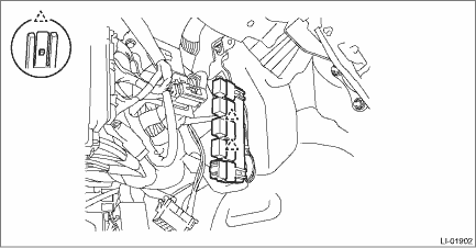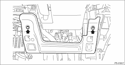 1. Disconnect the ground terminal from battery sensor. NOTE 2. Remove the cover assembly - instrument panel LWR driver. Instrument Panel Lower Cover > REMOVAL 3. Remove the bolts, and then remove the panel - knee guard.
