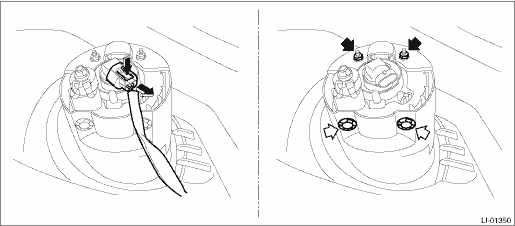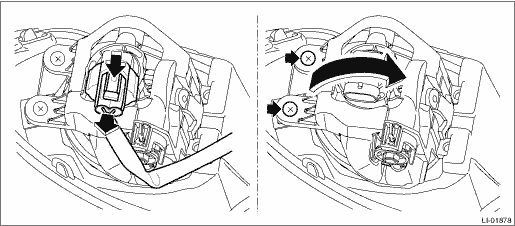 4. Remove the fog light assembly - front. (1) Disconnect the connector. (2) Remove the screws and clips, and remove the fog light assembly - front. • Sedan model