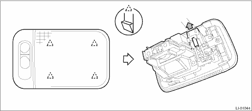 NOTE: Do not remove the luggage room light if removing the bulb only. 1. Disconnect the ground terminal from battery sensor. NOTE 2. Remove the luggage room light. (1) Release the claws. (2) Disconnect the connector and remove the light assembly - luggage room.