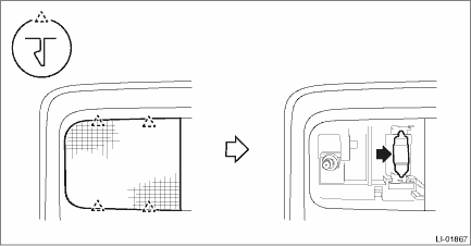 3. Remove the stereo camera cover assembly. (Models with EyeSight) Stereo Camera > REMOVAL 4. Release the claws, then detach the spot map light cover and bulb. CAUTION: • Use a dry clean cloth so that no grease or water adheres to the glass portion of the bulb. • When using a flat tip screwdriver, apply protective tape or cloth and be careful not to cause damage.